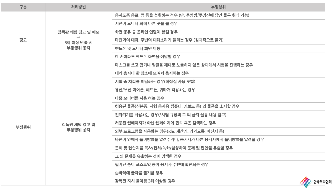 웹캠과 스마트폰의 모니터링 어플을 통해 부정행위를 방지하고 있는데, 시험 감독관은 보이지 않지만, 실시간 채팅을 통해 부정행위 (한숨, 기침, 화면 이탈 등)을 감시하고 경고합니다. 모니터링 어플로 주위를 한 바퀴 비춰야하기 때문에 가능한 시험 주위 환경을 깔끔히 정리하고, 듀얼 모니터를 사용하는 경우 담요나 외투 등으로 비응시하는 모니터를 가려야합니다.
