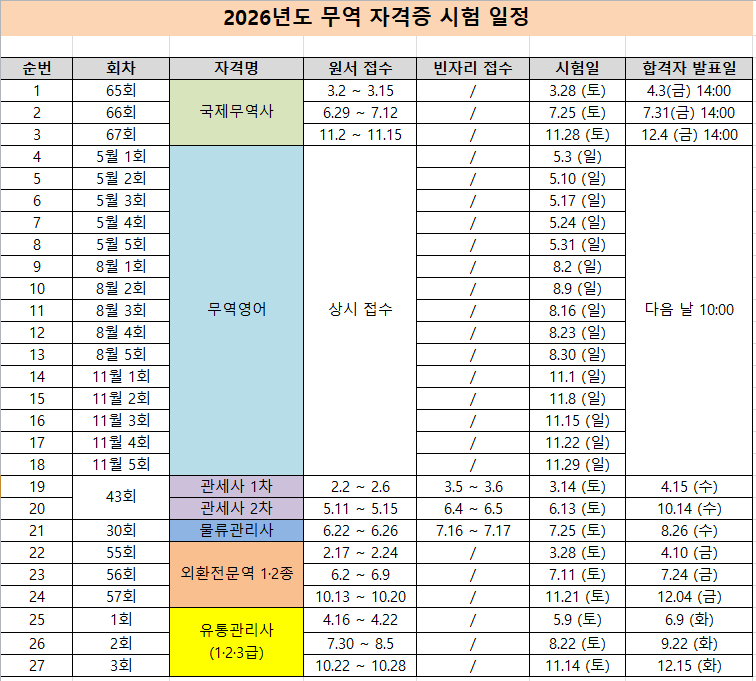 2026년 무역자격증 시험 일정 총정리본을 안내드립니다.
